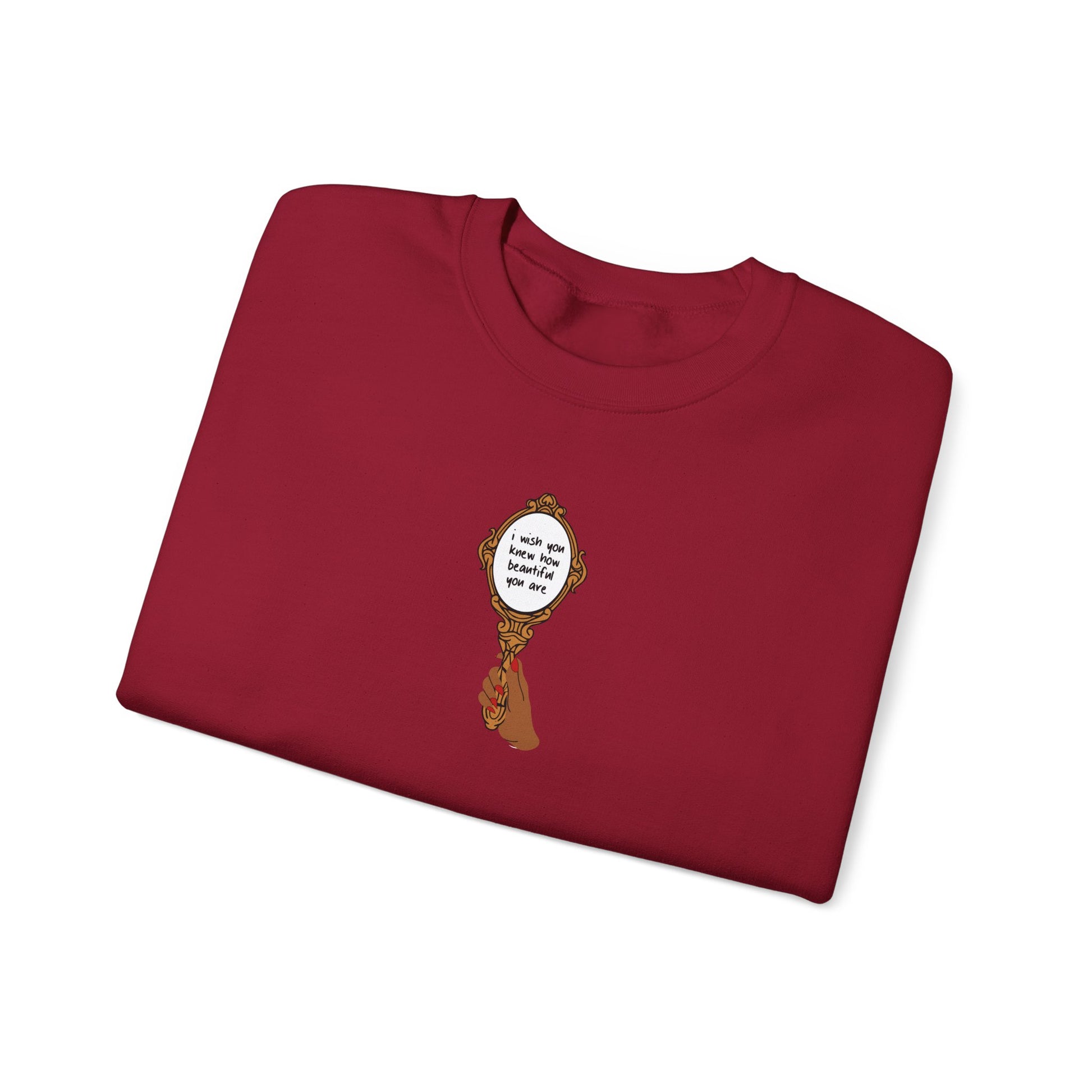 Sweatshirt featuring a handheld mirror design with I Wish You Knew lyrics. Available in Cardinal Red or Sport Grey and a choice of 4 different skin tones for the design (Rose, Scarlet, Poppy, or Cerise). 50% cotton/50% polyester