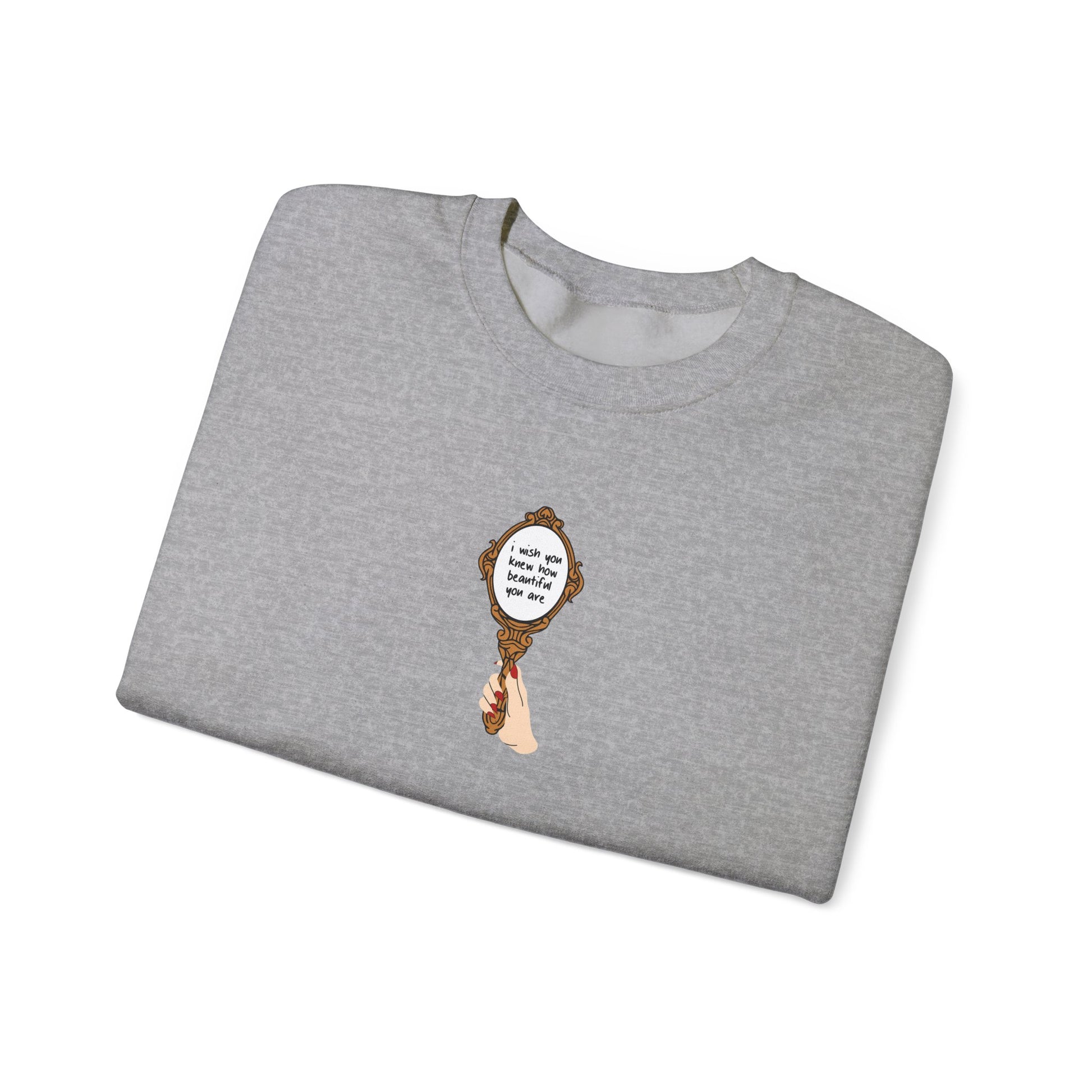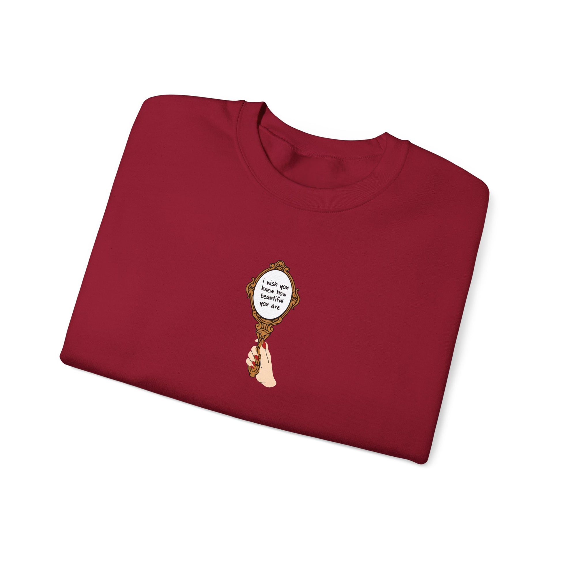 Sweatshirt featuring a handheld mirror design with I Wish You Knew lyrics. Available in Cardinal Red or Sport Grey and a choice of 4 different skin tones for the design (Rose, Scarlet, Poppy, or Cerise). 50% cotton/50% polyester