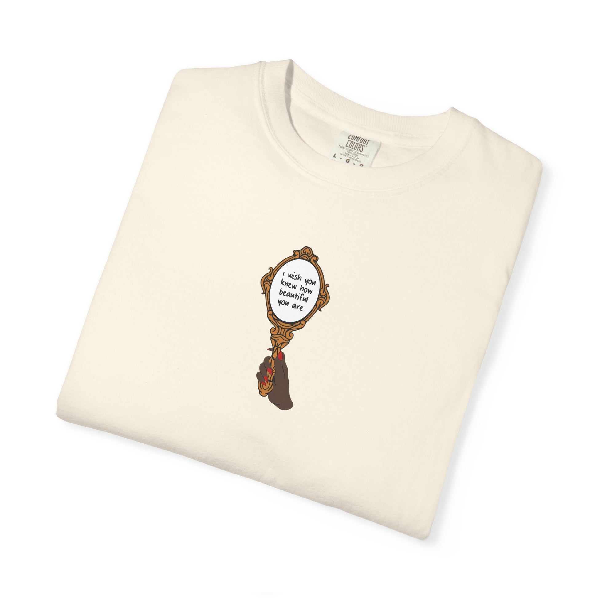 Comfort Colors T-Shirt featuring a handheld mirror design with I Wish You Knew lyrics. Available in Red or Ivory and a choice of 4 different skin tones for the hand design (Rose, Scarlet, Poppy, or Cerise). 100% cotton