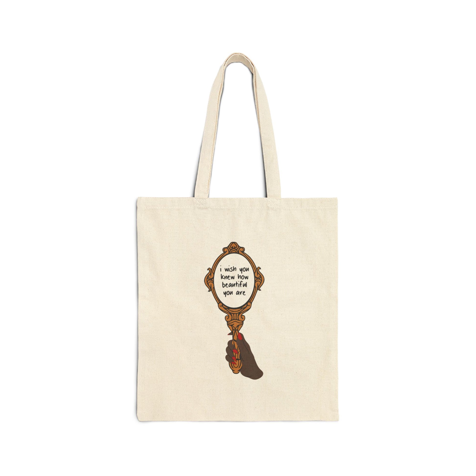 Tote bag featuring a handheld mirror design with I Wish You Knew lyrics. Available in Natural or Black and a choice of 4 different skin tones for the hand design (Rose, Scarlet, Poppy, or Cerise). 100% cotton canvas