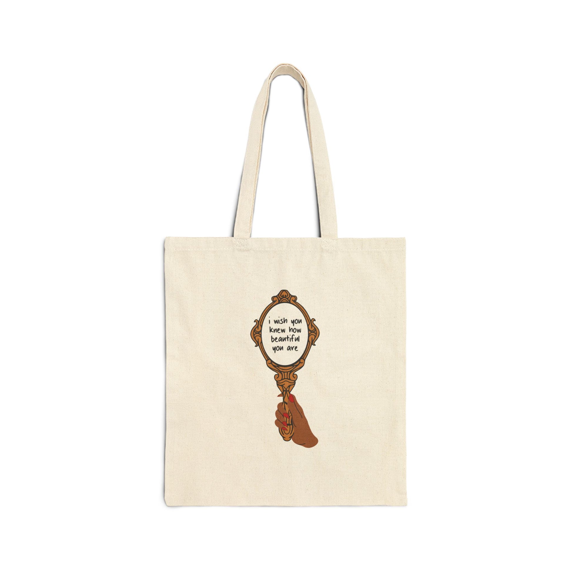 Tote bag featuring a handheld mirror design with I Wish You Knew lyrics. Available in Natural or Black and a choice of 4 different skin tones for the hand design (Rose, Scarlet, Poppy, or Cerise). 100% cotton canvas